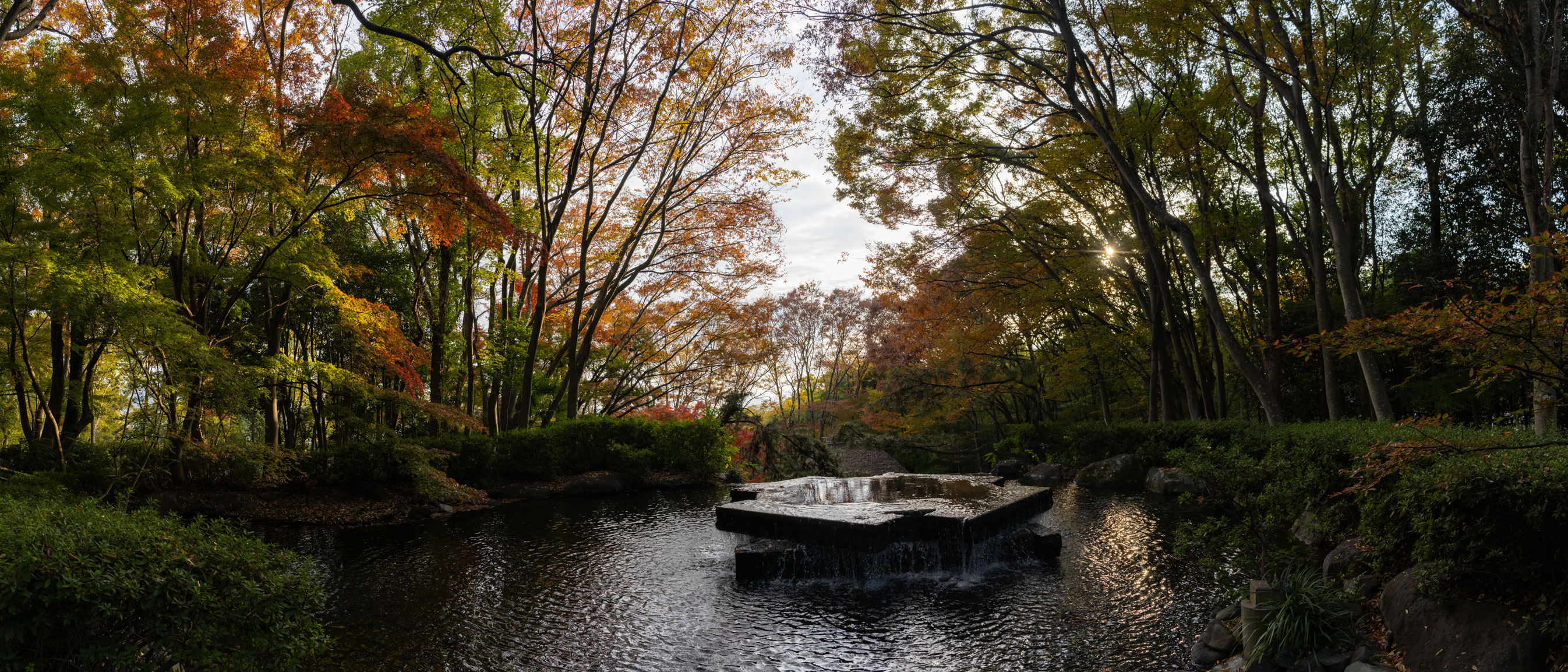 在游览的最后所到的是瀑布区,这里也有一些过去的染坊建筑。但也都是走马观花地看一下,所能想到的无非是很像十几年前老家那边的民房。印象比较深的是走过竹林小岛后看到的染瀑和“组石”,这个时间的夕阳照着枫叶,再听着潺潺流水,难得一会宁静。离开四国村后便找了一趟公交回到市区,比起电车自然就慢了许多,坐到港口需要经过三十个站,又同昨日一样在港口等到太阳完全落下才去觅食。